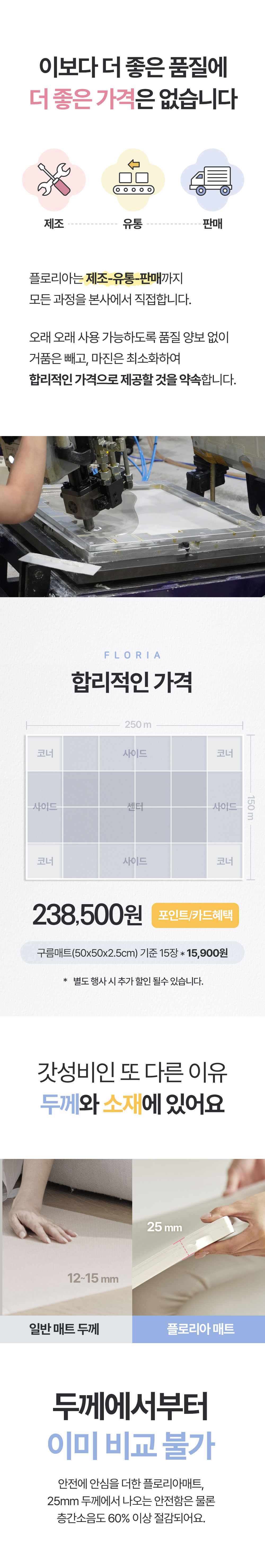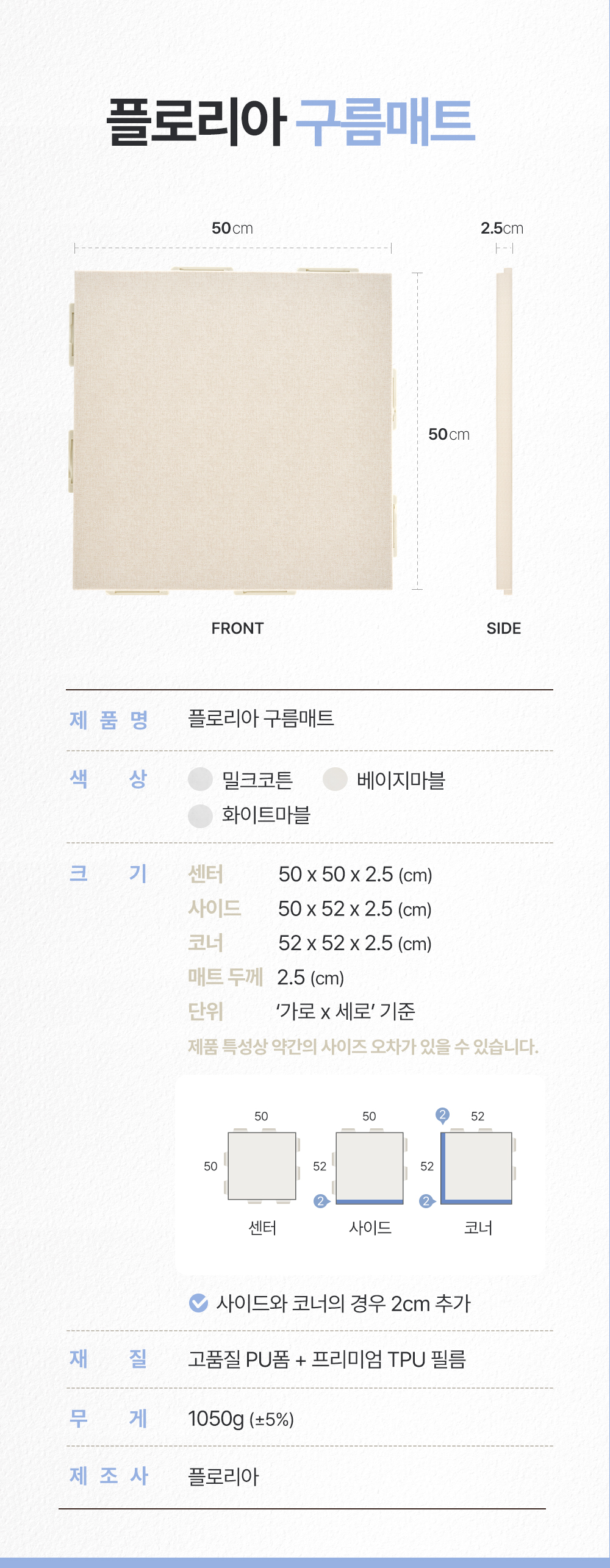 50x50x2.5cm / 1,050g으로 제작되어 초고밀도의 합리적인 가격으로 판매되고 있습니다.