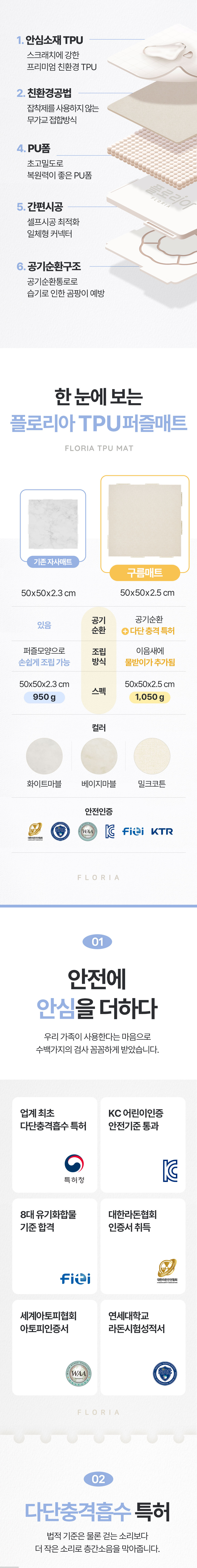 국내 최초 다단충격흡수 특허 등록 및 대한 라돈 제품/아토피 인증서등 다양한 인증서로 안전성을 입증 받았습니다.