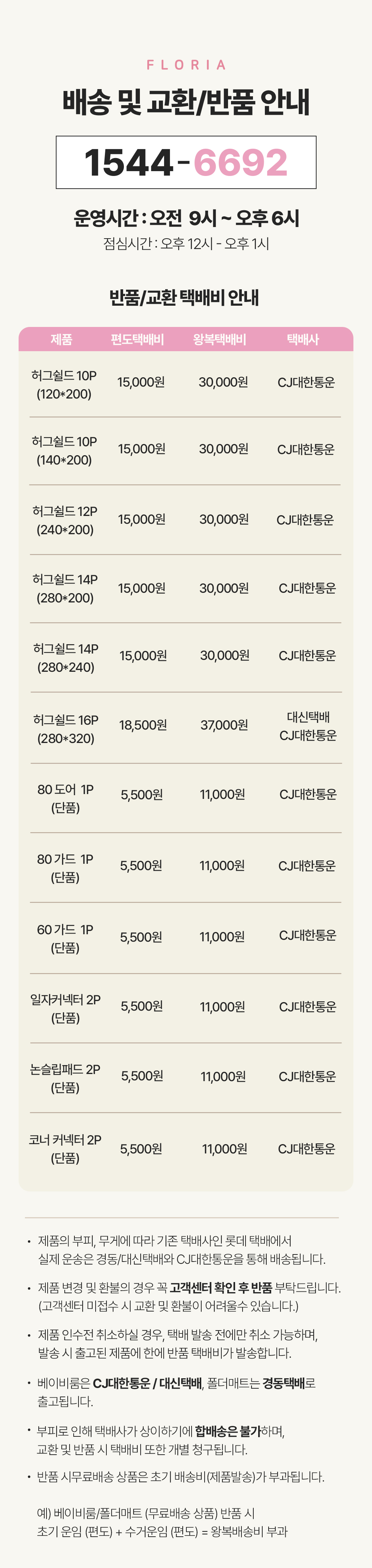 상호명: 플로리아 ㅣ 주소 : 경기도 화성시 서신면 용두리 658-4, 플로리아 대표자: 유다빈 | 사업자번호 : 228-07-64504 [사업자정보확인] 통신판매업등록번호: 2022-화성서신-0038호 | TEL: 1544-6692 EMAIL : floriahouse@naver.com