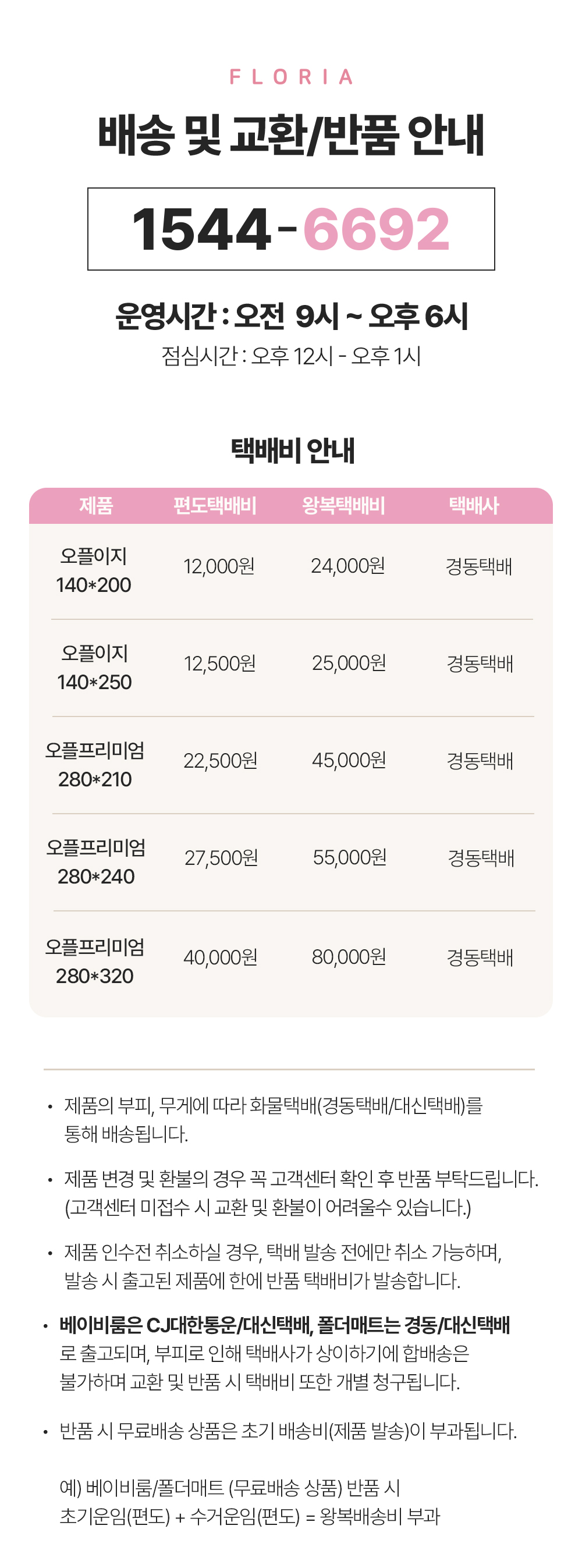 상호명: 플로리아 ㅣ 주소 : 경기도 화성시 서신면 용두리 658-4, 플로리아 대표자: 유다빈 | 사업자번호 : 228-07-64504 [사업자정보확인] 통신판매업등록번호: 2022-화성서신-0038호 | TEL: 1544-6692 EMAIL : floriahouse@naver.com